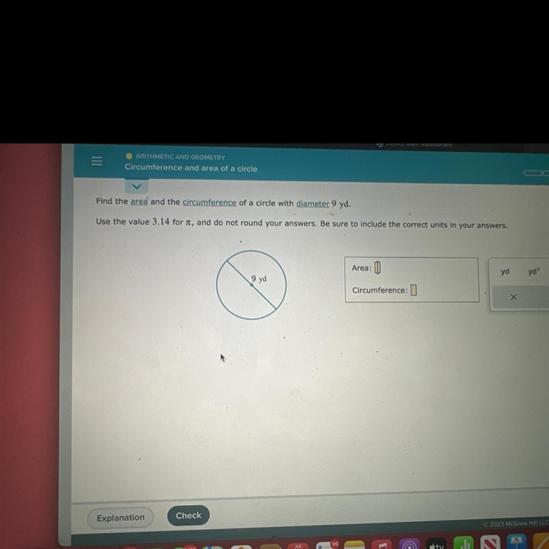 Find the area and the circumference of a circle with diameter 9 yd. Use the value-example-1