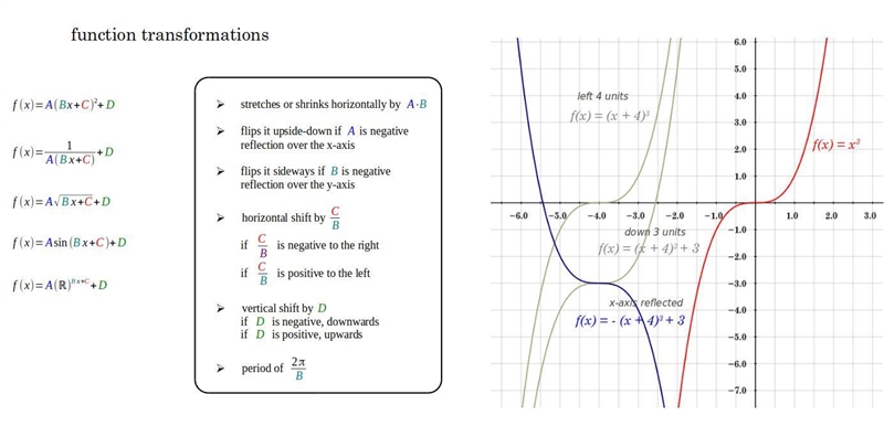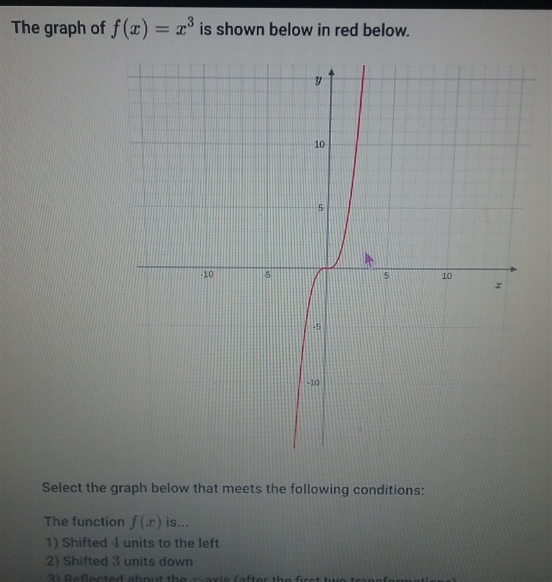 The graph of f(x) = x³ is shown below in red below. The function f (x) is 1) shifted 4 units to the left 2) Shifted 3 units down 3) Reflected about the x-axis (after the frist t…