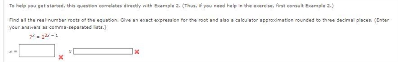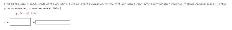 x = (ln 2)/(3 ln 2 - ln 7) = about 5.191
