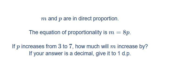 Step-by-step explanation: When p increases from 3 to 7, the increase in p is 7 - 3 = 4. Since m = 8p, the increase in m will be 8 times the increase in p, which is 8 * 4 = 32.