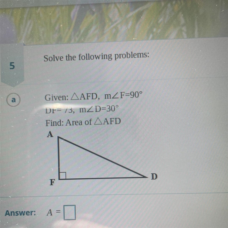 Solve the following problems: Given: AAFD, mZF=90° AD = 14, mZD=30° Find: Area of AAFD F D