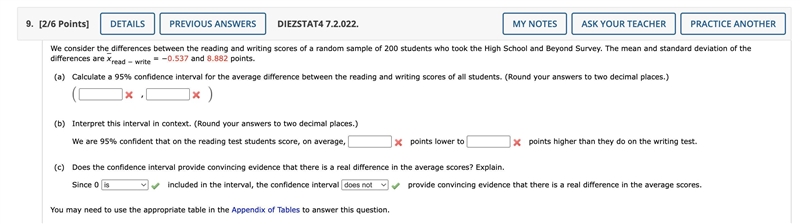 (b) We are 95% confident that on the reading test students score, on average, 1.22 points lower to 0.15 points higher than they do on the writing test.