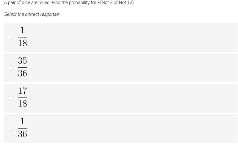 So, the probability of rolling a pair of dice and not getting a sum of 2 or 12 is 17/18.