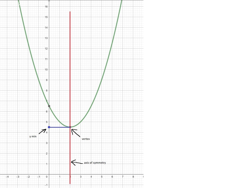 For the following quadratic function, (a) find the vertex, the axis of symmetry, and the maximum or minimum function value, and (b) graph the function. h(x) =1/2x^2-2x+13/2