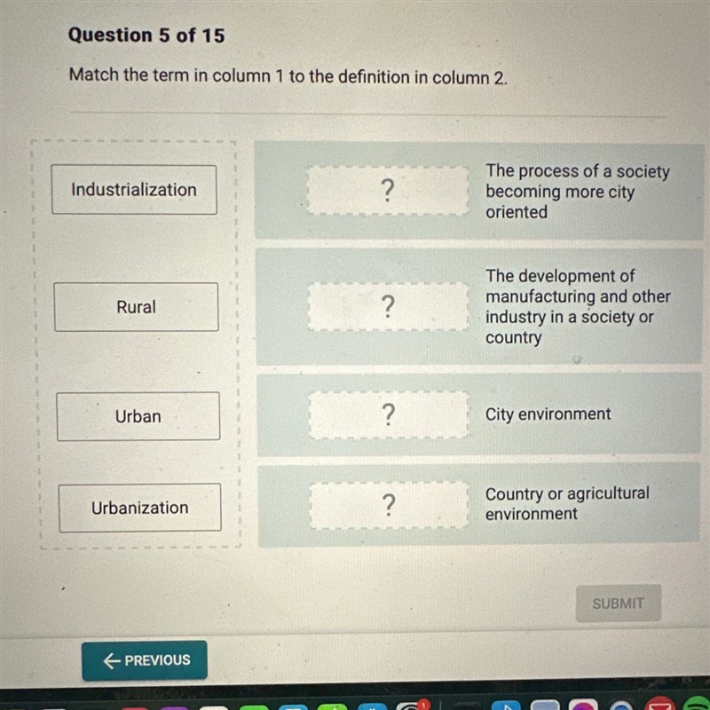 Answer: Industrialization: 2, Rural: 4, Urban: 3, Urbanization: 1