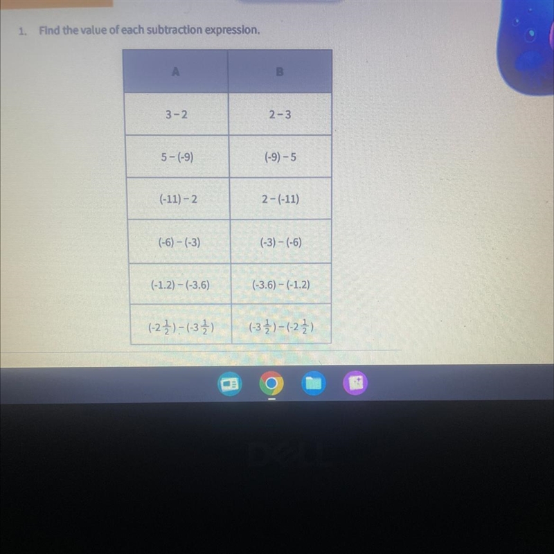 1. Find the value of each subtraction expression. A 3-2 5-(-9) (-11)-2 (-6)-(-3) B 2-3 (-9)-5 2-(-11) (-3) -(-6)