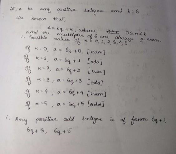 Clearly, 6q + 1, 6q + 3 and 6q + 5 are of the form 2k + 1, where k is an integer. Therefore, 6q + 1, 6q + 3 and 6q + 5 are not exactly divisible by 2. Hence, these expressions of numbers are odd numbers and therefore any odd integers can be expressed in the form 6q + 1 or 6q + 3 or 6q + 5.