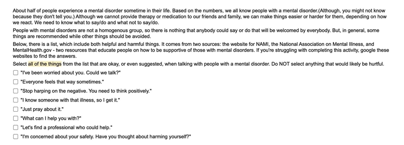Select all of the things from the list that are okay, or even suggested, when talking with people with a mental disorder. Do NOT select anything that would likely be hurtful.