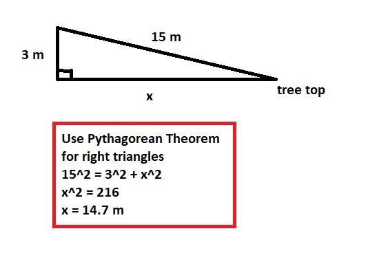 15. A tree 18 meter-high is broken off 3 meter from the ground. How far from the foot of the tree will the top strike the ground?