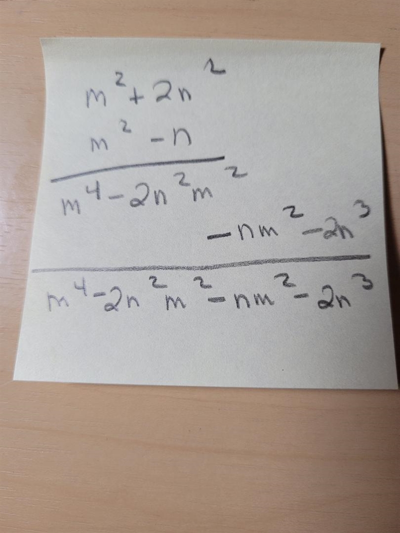 Write the expression as a polynomial: (m^2-n)(m^2+2n^2).