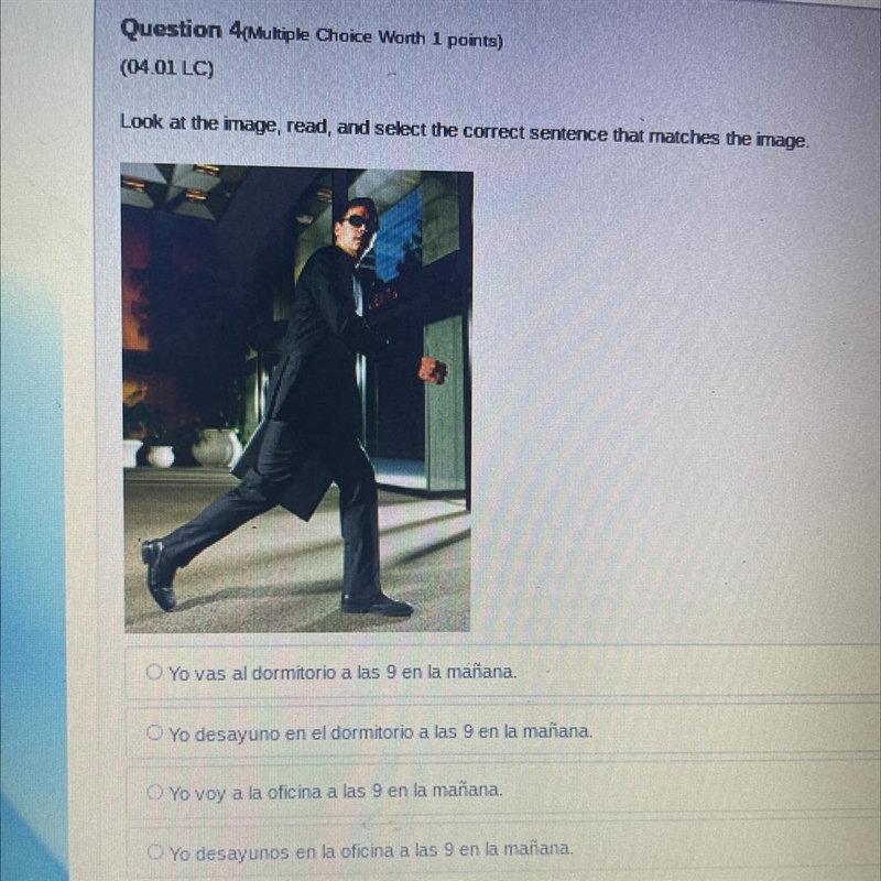 Answer: The correct sentence that matches the image is: "Yo voy a la oficina a las 9 en la mañana."