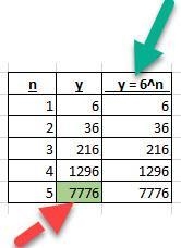 If we continue with higher values of n, we find that function c always gives the correct result. See the table. By using n = 5, we obtain the value of 7776 (green cell), which is the value requested in the problem. The sequence is geometric and results in 7776 when n = 5.