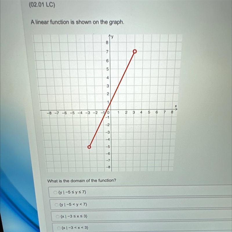The open circles which serve as the endpoints of the linear function indicate that the -3 in (-3, -5) and the 3 in (3, 7) are not included in the domain and we use the < symbol to show this.