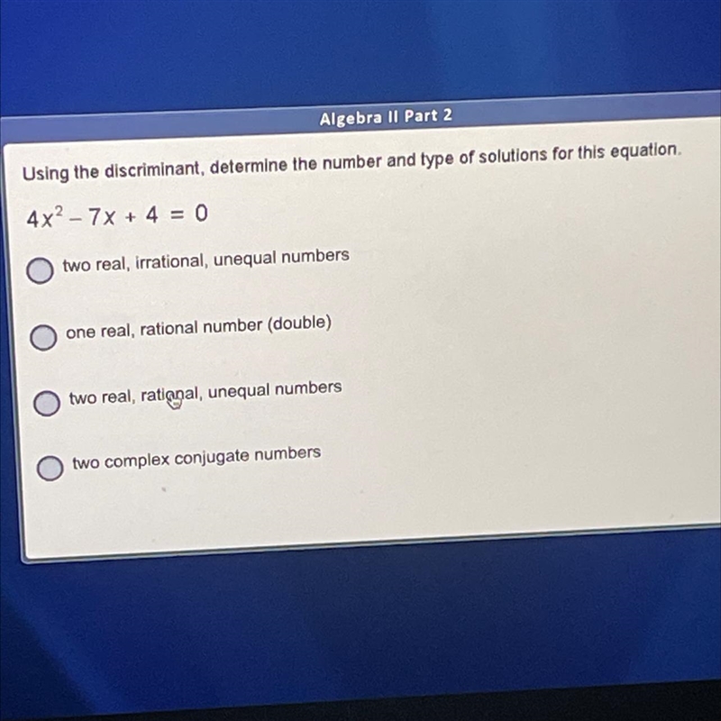 • if b² - 4ac > 0 and a perfect square, then two real, rational solutions