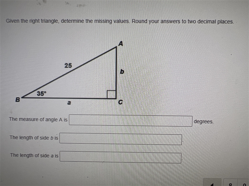 Thus, we can find the length of side a by substituting 35 for θ and 25 for the hypotenuse in the cosine ratio:
