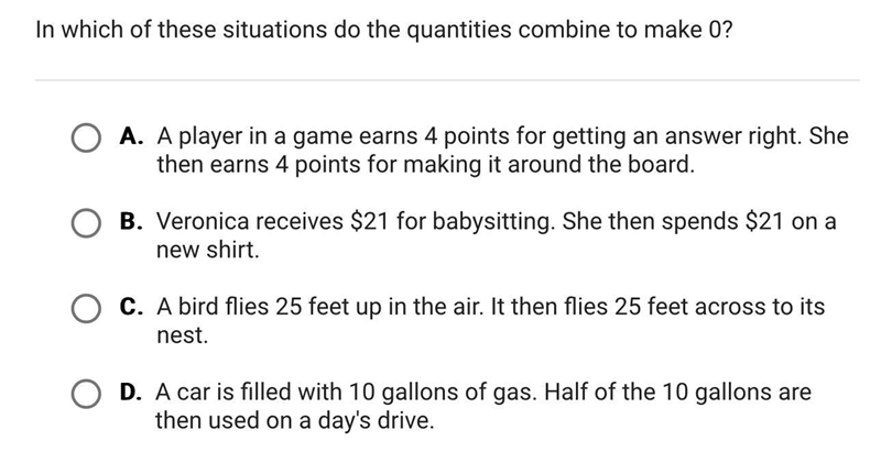With B, Veronica makes $21 babysitting. This means she has $21 but then she spends $21 on a new shirt, so she no longer has any money.