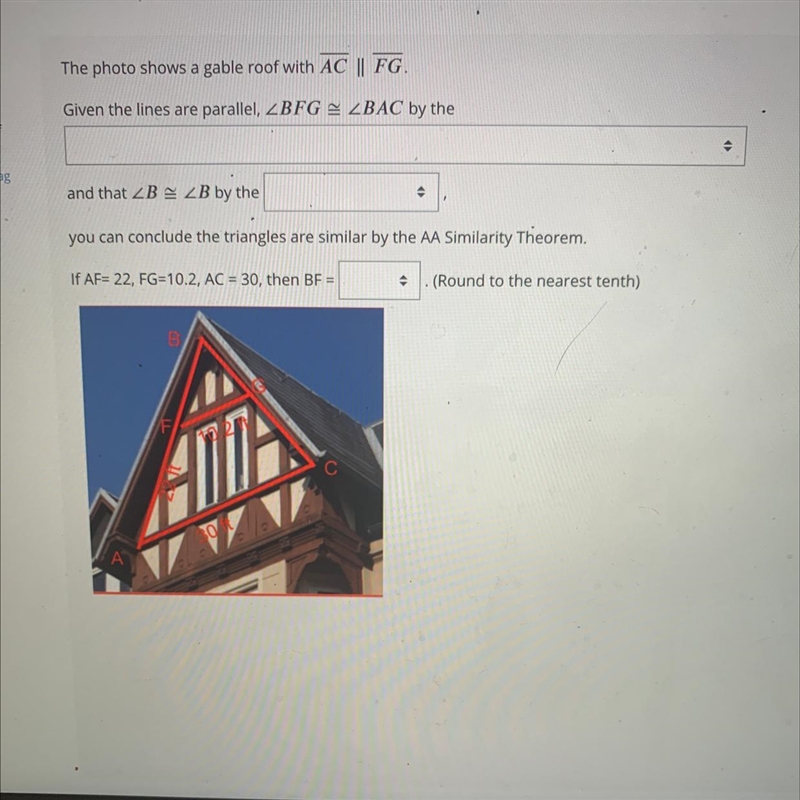 , which then we need to cross multiply (the diagonal numbers should be multiplied). This would give 30x=224.4, and the we divide, giving x=7.48, meaning line segment BF would equal 7.5 (rounded to the nearest tenth). I'm not sure what's underneath that blank, but I think that's the correct answer.