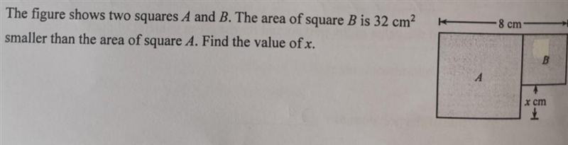 Side of Square A ⇒ a = Side of Square B + x⇒ a = b + xand we know that ∴ cmIt is also given that, a + b = 8