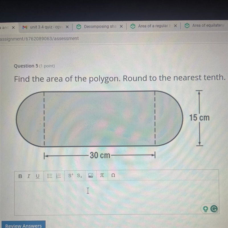Find the area of the polygon. Round to the nearest tenth. 30 cm- length 15 cm- height-example-1