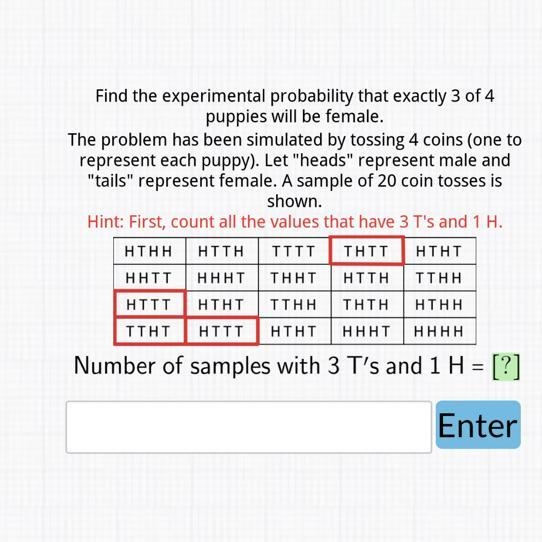 Find the experimental probability that exactly 3 of 4 puppies will be female . The problem has been simulated by tossing 4 coins (one to represent each puppy). Let " heads" represent male and "tails" represent female. A sample of 20 coin tosses is shown. Hint: First, count all the values that have 3 T's and 1 H. HTHHHTTHTHTTHTHT HHTT HHHT THHT HTTHTTHH HTTT HTHT TTHH THTH HTHH TTHT HTTT HTHTHHHTHHHH