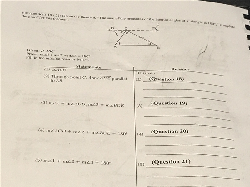 21) If mACD + m2 + mBCE = 180, and mACD = m1 and mBCE = m3, substitute, and you get m1 + m2 = m3