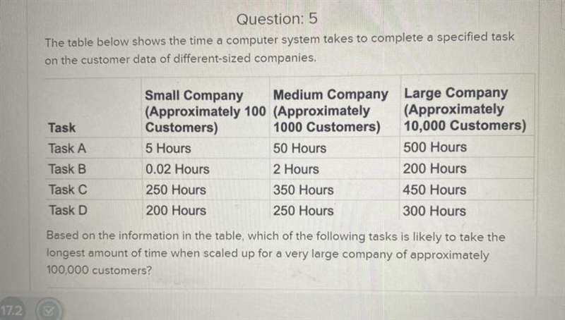 Task B will take the longest time, since the time is takes is multiplied by 100 each time.