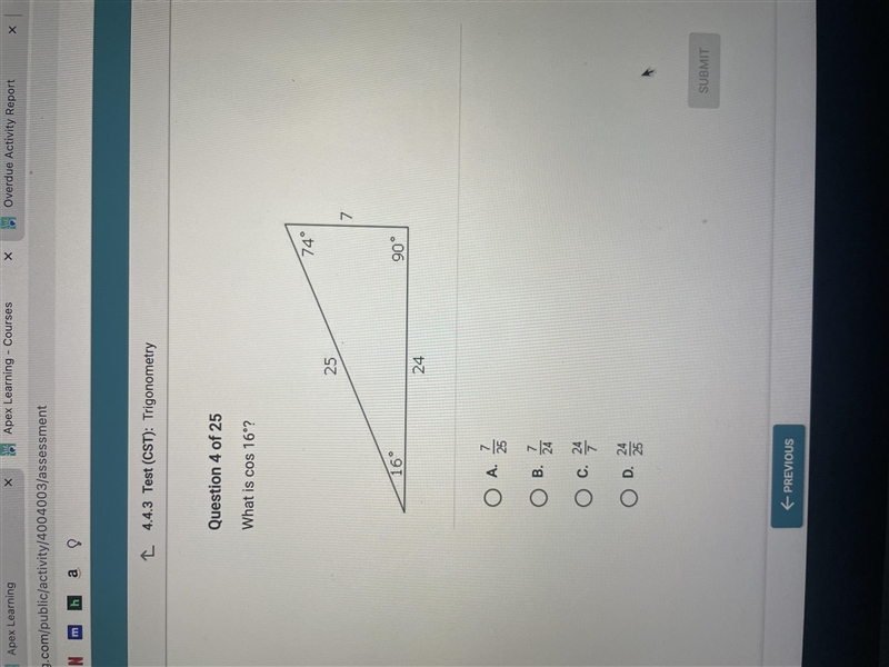 In the given options, the correct answer is not explicitly given as "0.96". However, we can use the trigonometric identity cos(90° - θ) = sin(θ) to find the value of cos 16°.