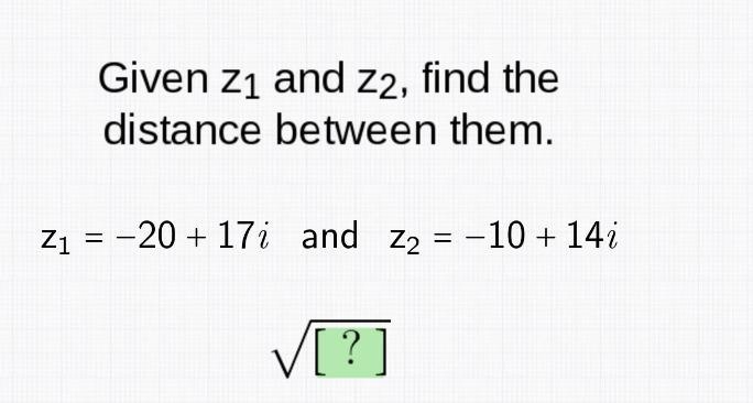 PLEASE HELP Given z1 and z2, find the distance between them. z1 = -20 + 17i and z-example-1