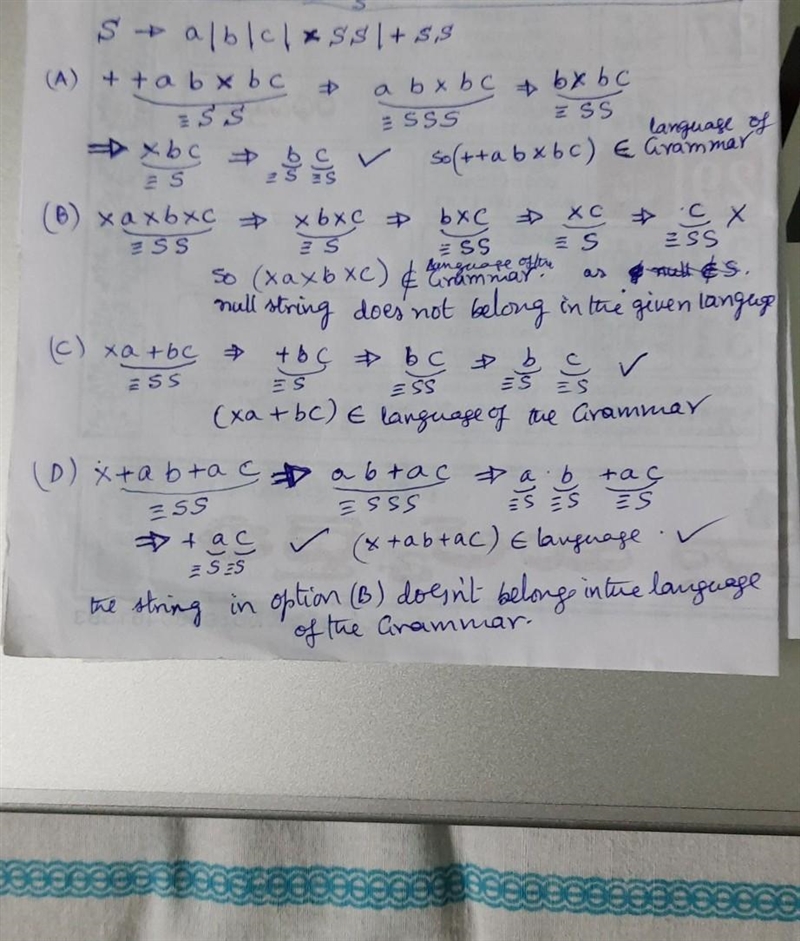 The string given in the Option B doesn't belong to the language of the given grammar.
