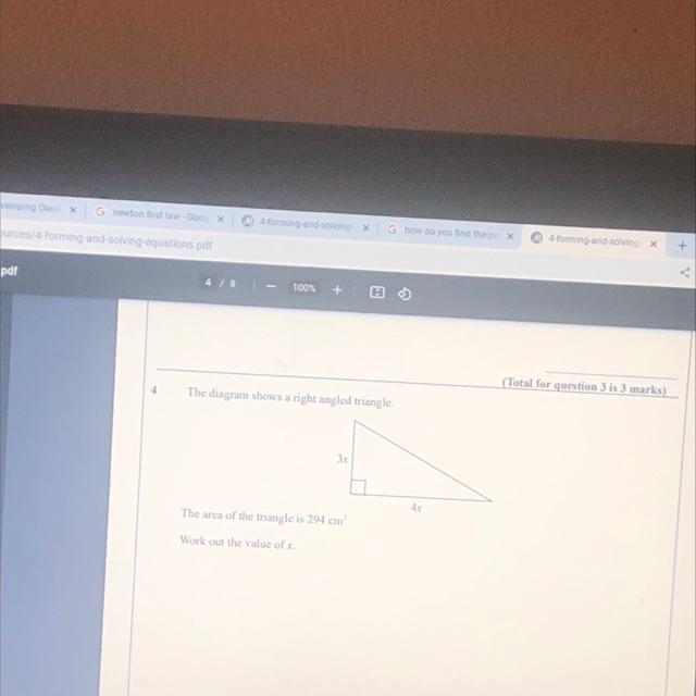The diagram shows a right angled triangle. 3x The area of the triangle is 294 cm² Work out the value of x. 4x