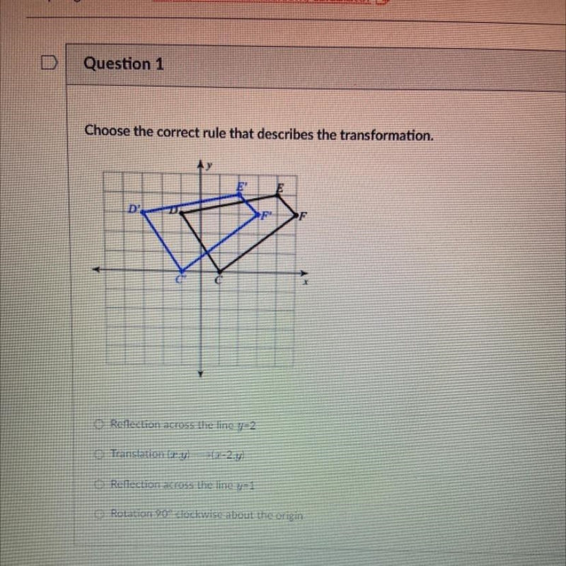 All the other options are incorrect as they either put the prime shape into a different quadrant or change its orientation. It is simply moving back 2 units in the x coordinate so B would be correct.