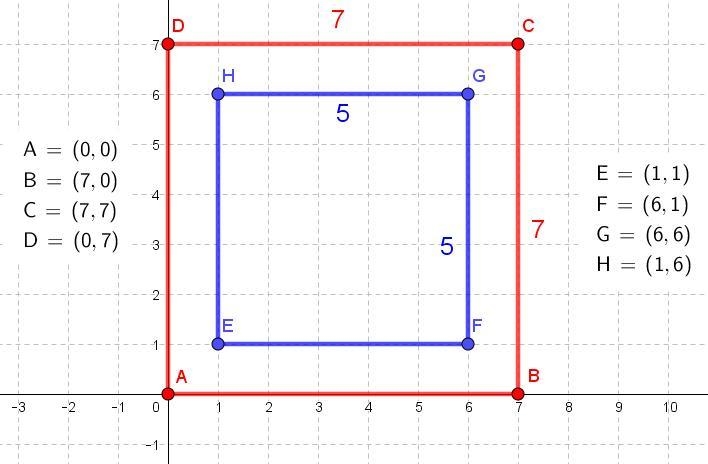 To recap, the smaller square has each side 5 units long, while the larger square has each side 7 units long.