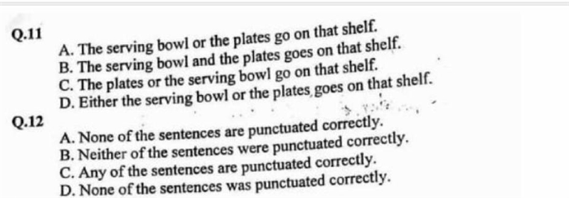 Option A ("The serving bowl or the plates go on that shelf") is correct because it follows the rule of subject-verb agreement. The verb "go" agrees with the subject "the serving bowl" or "the plates".