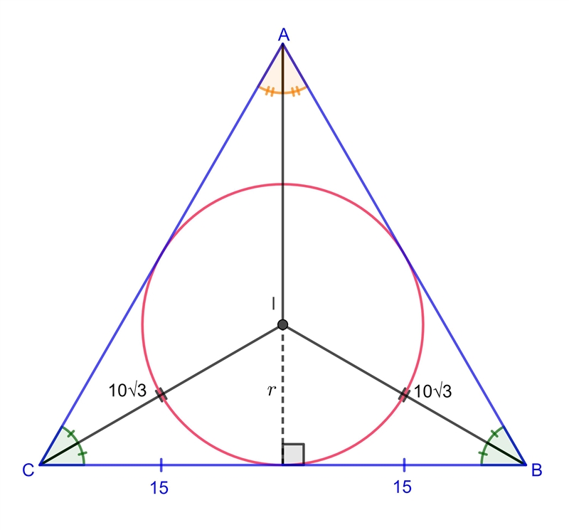 This creates the isosceles triangle BIC, where IB = IC = 10√3, and BC = 30.