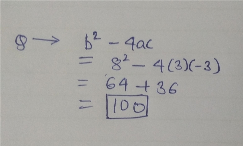 b² - 4ac ← substitute a = 3, b = 8, c = - 3 into the expression