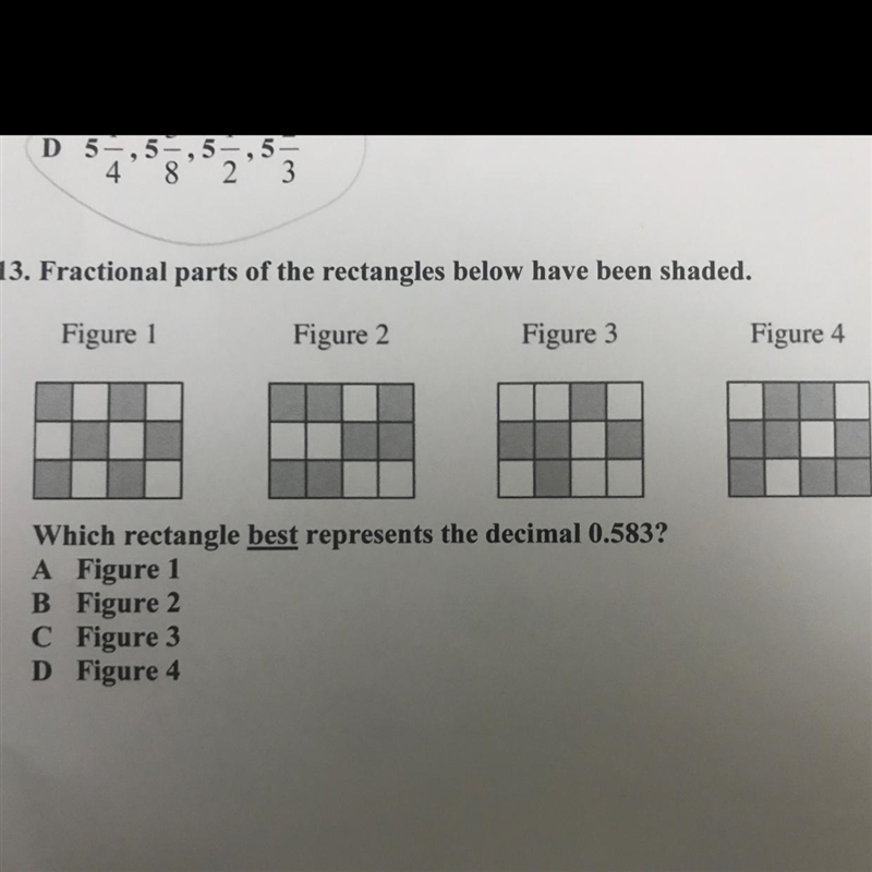 13. Fractional parts of the rectangles below have been shaded. Figure 1 Figure 2 Figure 3 Which rectangle best represents the decimal 0.583?