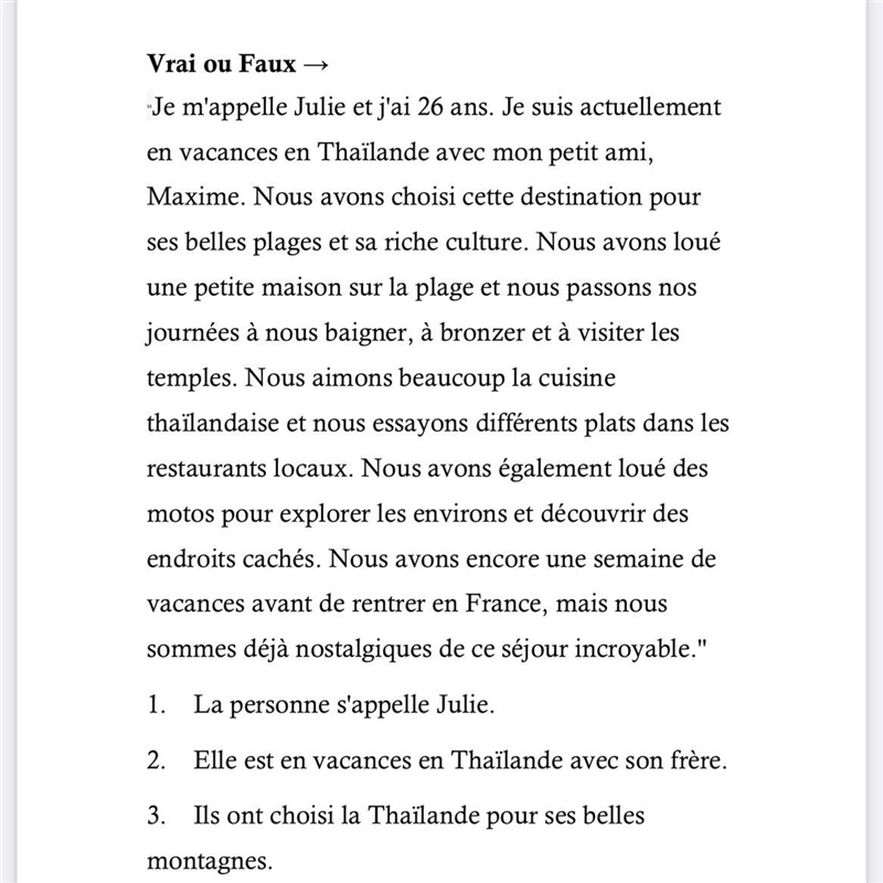 3) Faux ⇒ "Nous avons choisi cette destination pour ses belles plages"