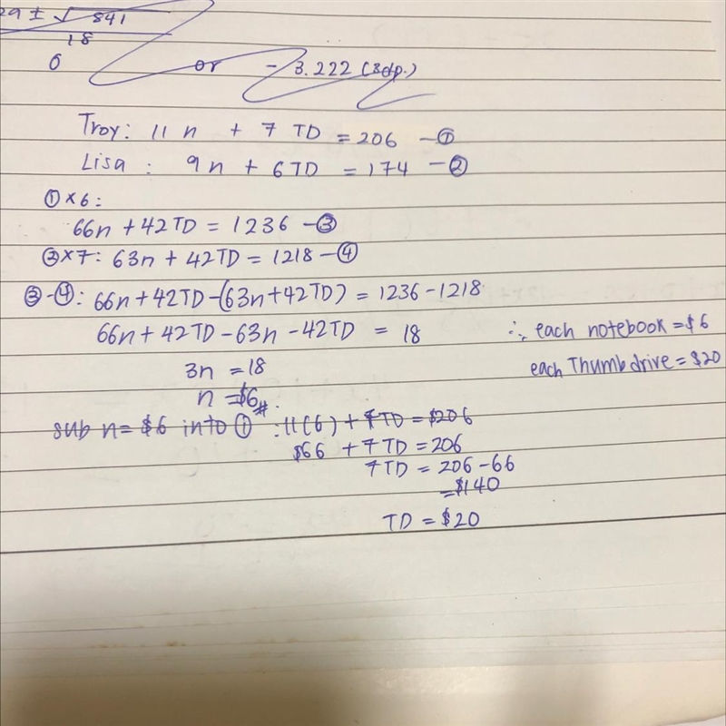 Troy and Lisa were shopping for school supplies. Each purchased different quantities of the same notebook and thumb drive. Troy bought 11 notebooks and 7 thumb drives for $206. Lisa bought 9 notebooks and 6 thumb drives for $174. Find the cost of each notebook and each thumb drive. The cost of each notebook = _______
