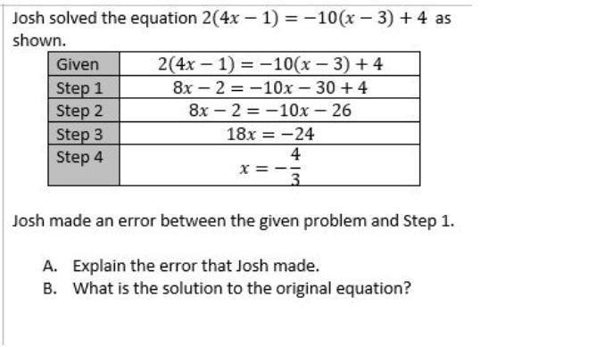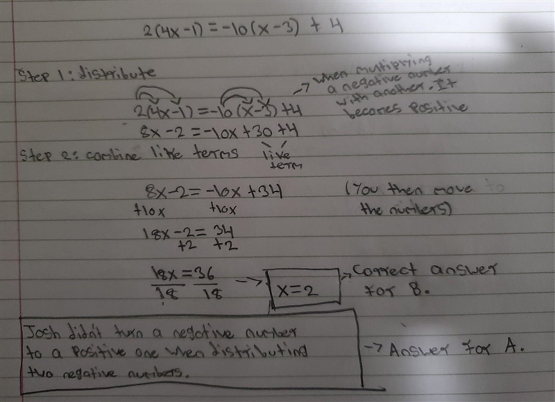 But the error that Josh made was when distributing/multiplying -10 and -3. When multiplying two negative numbers the sign basically flips and turns it into a positive number. So, instead of -30 it becomes 30. Then you just solve the rest like in the picture.