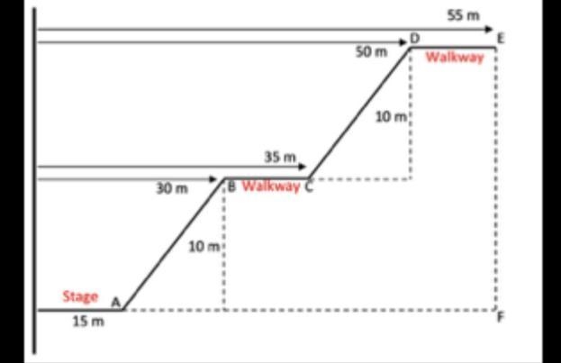 3) Calculate the total distance that you will walk/climb from the stage to the end of walkway E. (A to E). Convert the final length to mm. Show all your calculations.