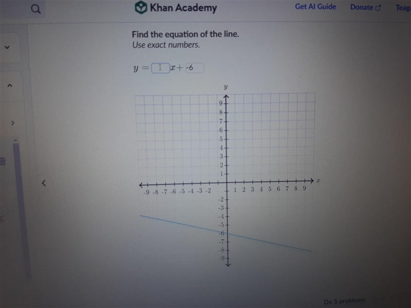 simply get the gradient of the graph you have one point (0,-6) find other points the line crosses eg(4,-7)... the gradient is calculated as change in y divided by change in x hence (-7--6)÷(4-0)