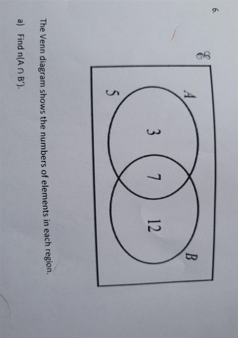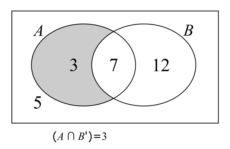 The notation n(A ∩ B') represents the number of elements in the intersection of set A and the complement of set B. In a Venn diagram, this would be the number of elements within the overlapping region of circle A and the region outside circle B.