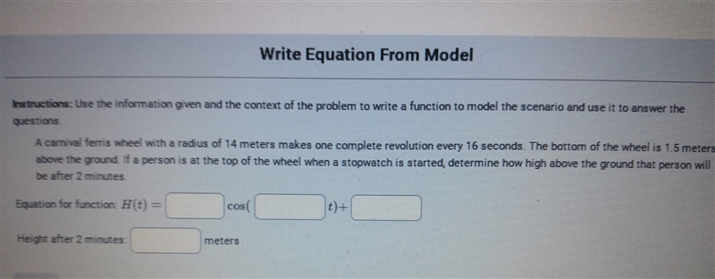 The height of the person on the carnival ferris wheel can be modeled using a cosine function.