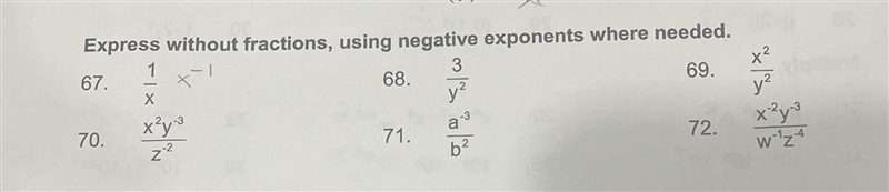 72) \large{ \frac{ {x}^( - 2) {y}^( - 3) }{ {w}^( - 1) {z}^( - 4) } = {x}^( - 2) {y}^( - 3) w {z}^(4) }