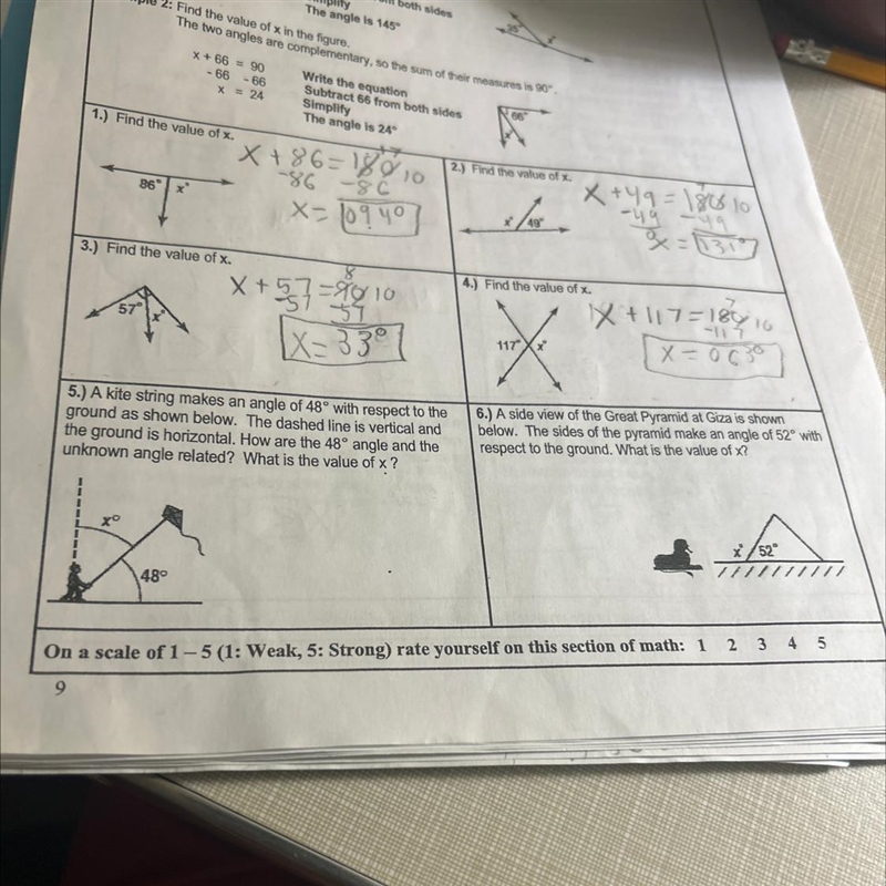 This angle is one part of a linear pair. The other angle in the linear pair is x, which is the angle formed between the sides and the base of the pyramid.