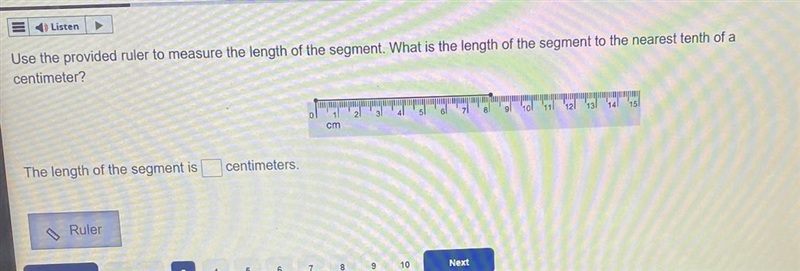 Listen Use the provided ruler to measure the length of the segment. What is the length of the segment to the nearest tenth of a centimeter? The length of the segment is centimet…