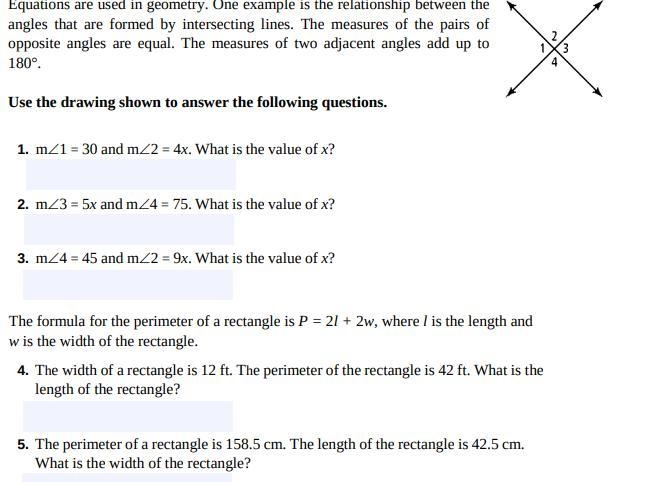 1) Angle 1 and Angle 2 are a linear pair (they make a straight angle; a line) which means they must add up to 180. 30+4x = 180 ; 4x= 150 ; x = 37.5