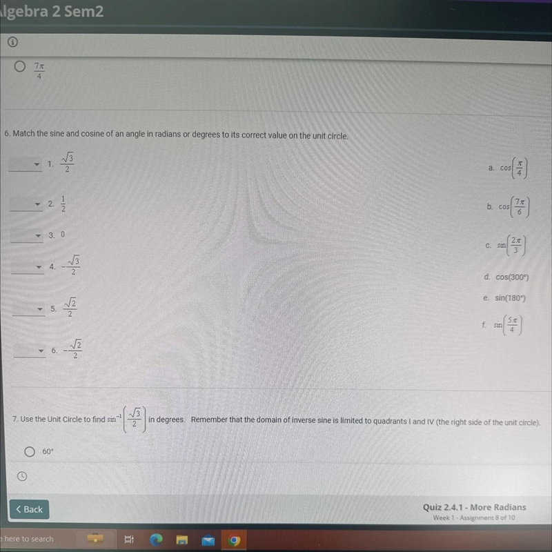 Match the sine and cosine of an angle in radians or degrees to its correct value on the unit circle. √3 2 1. 2. 3. 0 4. 10 6. 2 2 *(#) a. cos COS (77) b. cos C. sin d. cos(300°)…