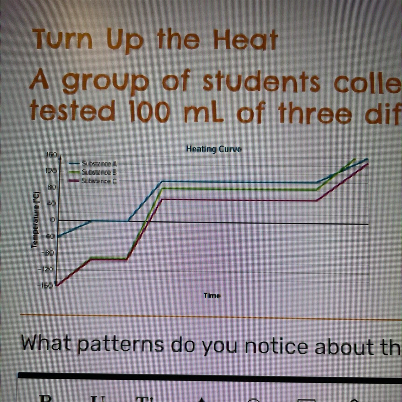 A group of students collected data using a similar procedure as the lab phase changes they tested 100 mL of three different substances the plot below has compiled from their data. What patterns do you notice about the plot?