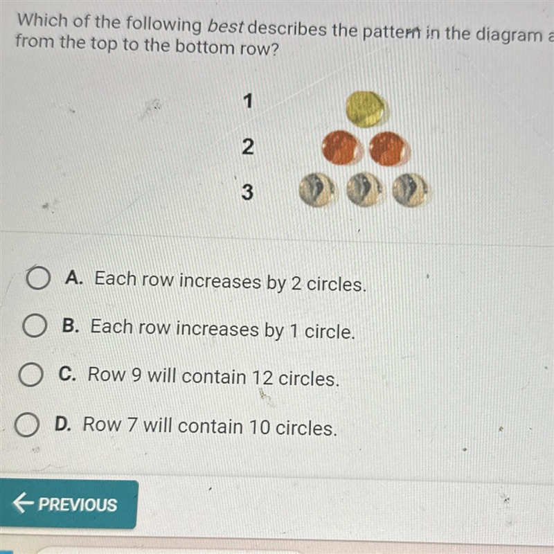 Which of the following best describes the patter in the diagram as you move from the top to the bottom row? A. Each row increases by 2 circles. OB. Each row increases by 1 circl…